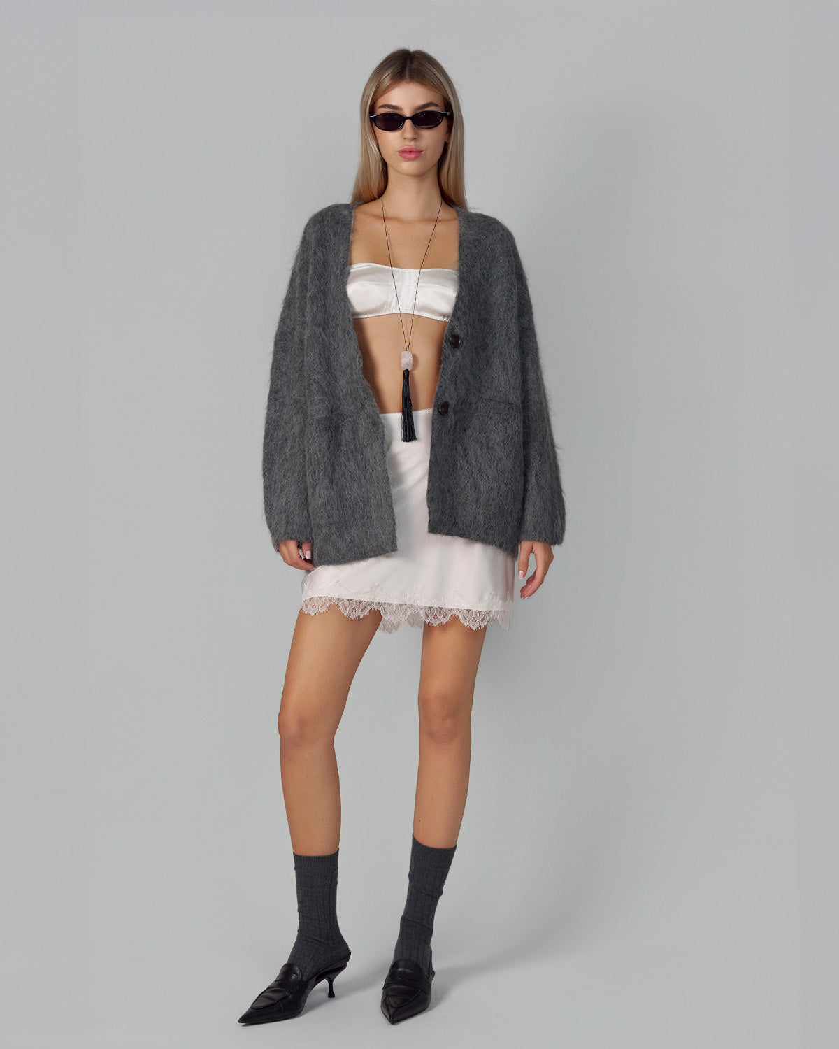Softness meets sophistication. Knitted from a luxurious alpaca-wool blend in an understated gray hue, this cardigan drapes effortlessly over the body for a relaxed yet refined look. Subtle texture and a clean finish make it an easy layer over crisp shirts or casual tees alike — an elevated essential for everyday dressing.
