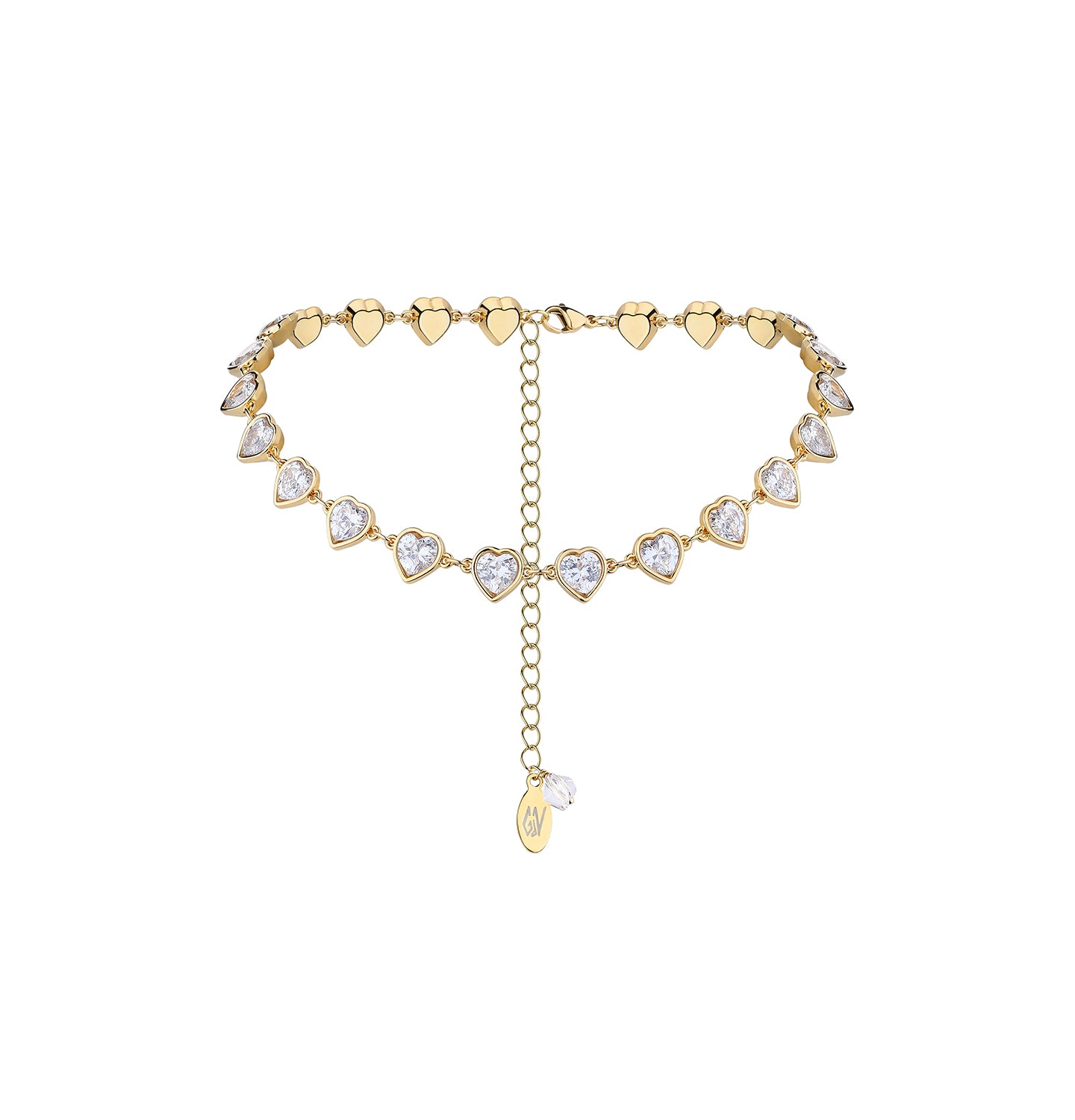 Made of gold-plated brass with crystal hearts. Nickel-free. Length: 33 cm + 10 cm extension chain.
