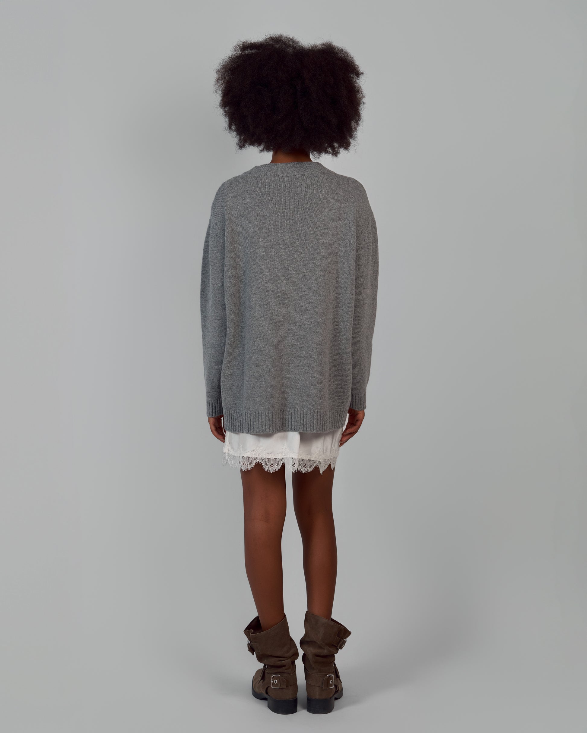 An essential piece of refined simplicity. Knitted from an ultra-soft blend of merino wool and cashmere, this sweater offers a weightless feel and a fluid drape against the skin. Its clean lines and relaxed silhouette embody quiet sophistication — perfect for layering or wearing solo as a statement of effortless luxury.