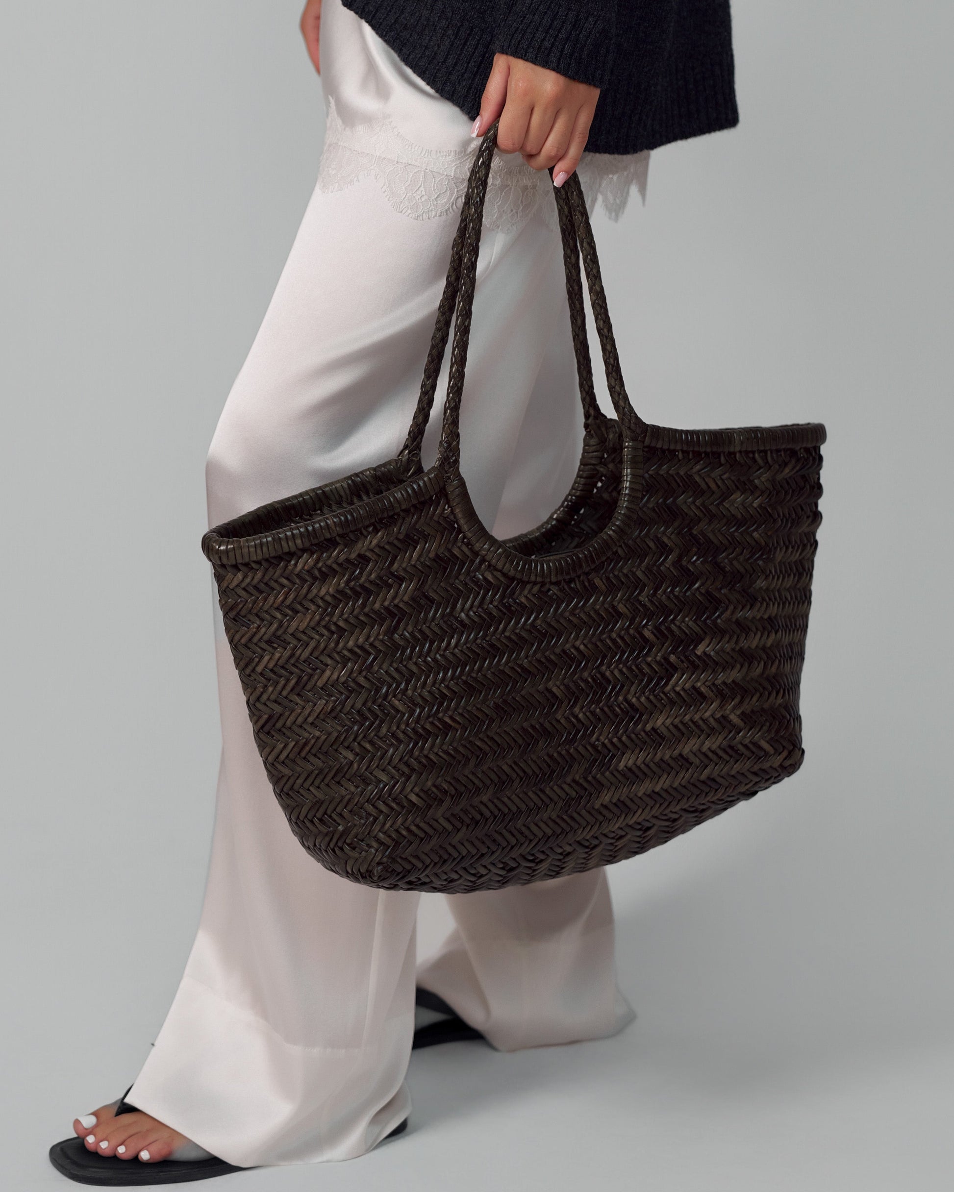 An ode to Italian craftsmanship. This handmade bag is woven from supple khaki leather using the traditional intrecciatotechnique — a signature of timeless luxury and artisanal precision. Its soft structure and minimalist silhouette make it an effortless statement piece, blending everyday functionality with refined elegance. Designed to age beautifully, it embodies the essence of quiet sophistication.