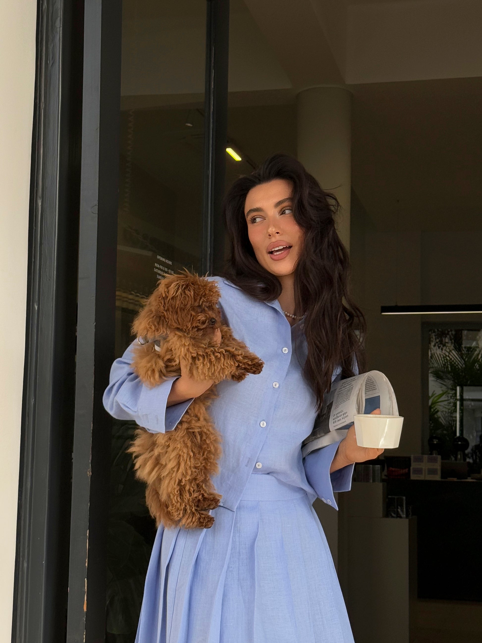Blue linen suit made of 100% natural fabric — a stylish and comfortable choice for the warm season. The relaxed-fit shirt with a classic collar and long sleeves is paired with straight trousers featuring an adjustable drawstring waist. Lightweight and breathable, this set is perfect for both everyday looks and leisure.