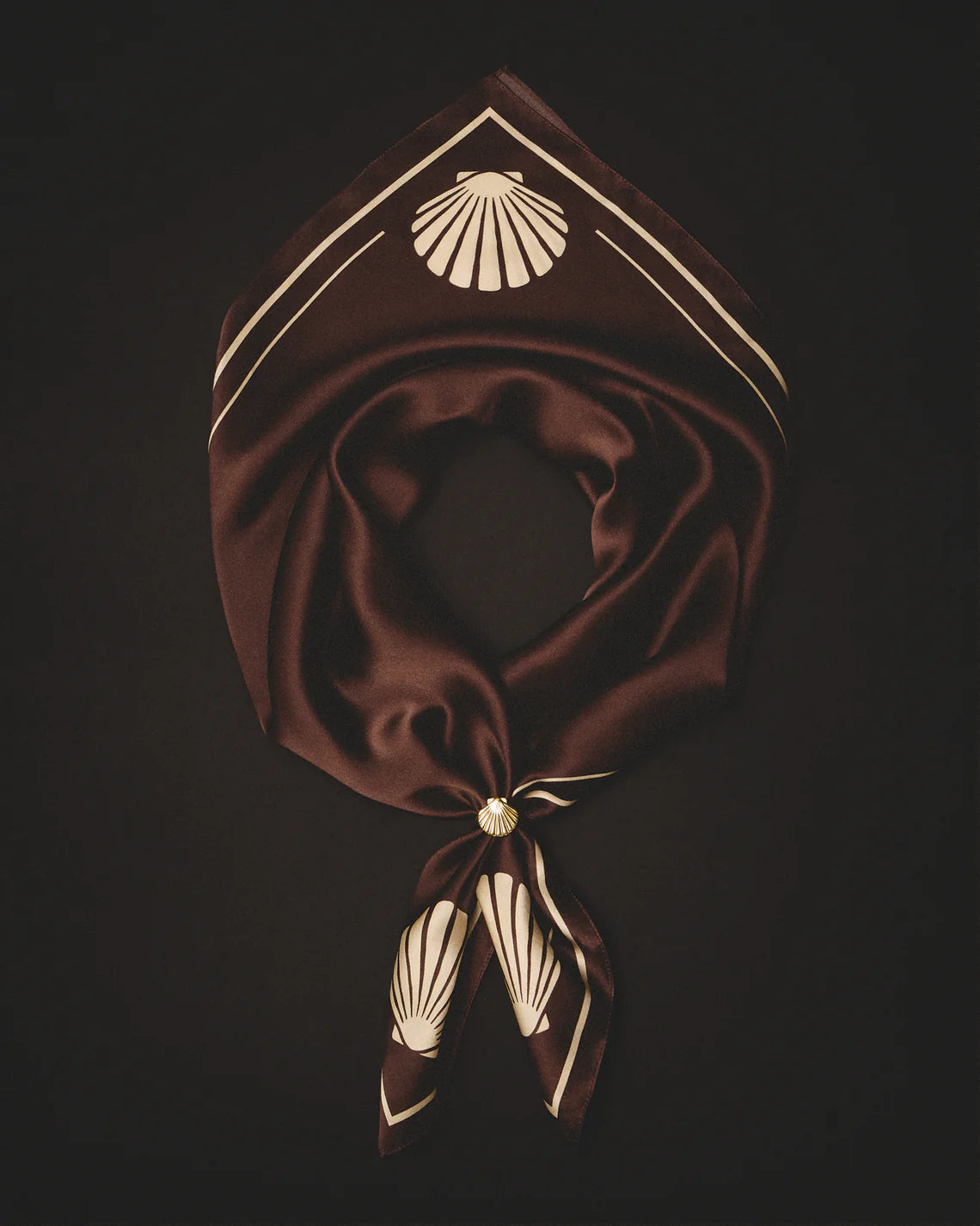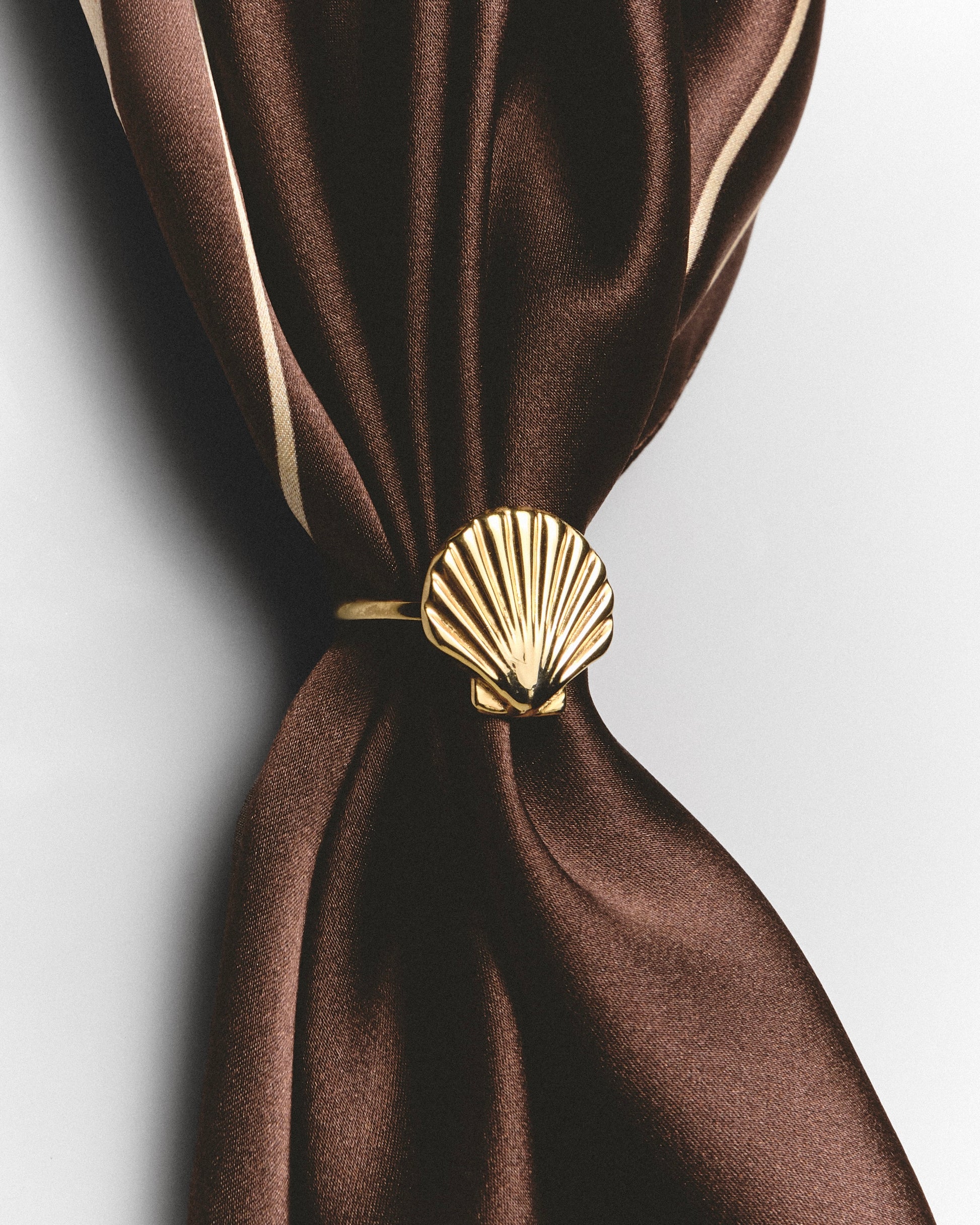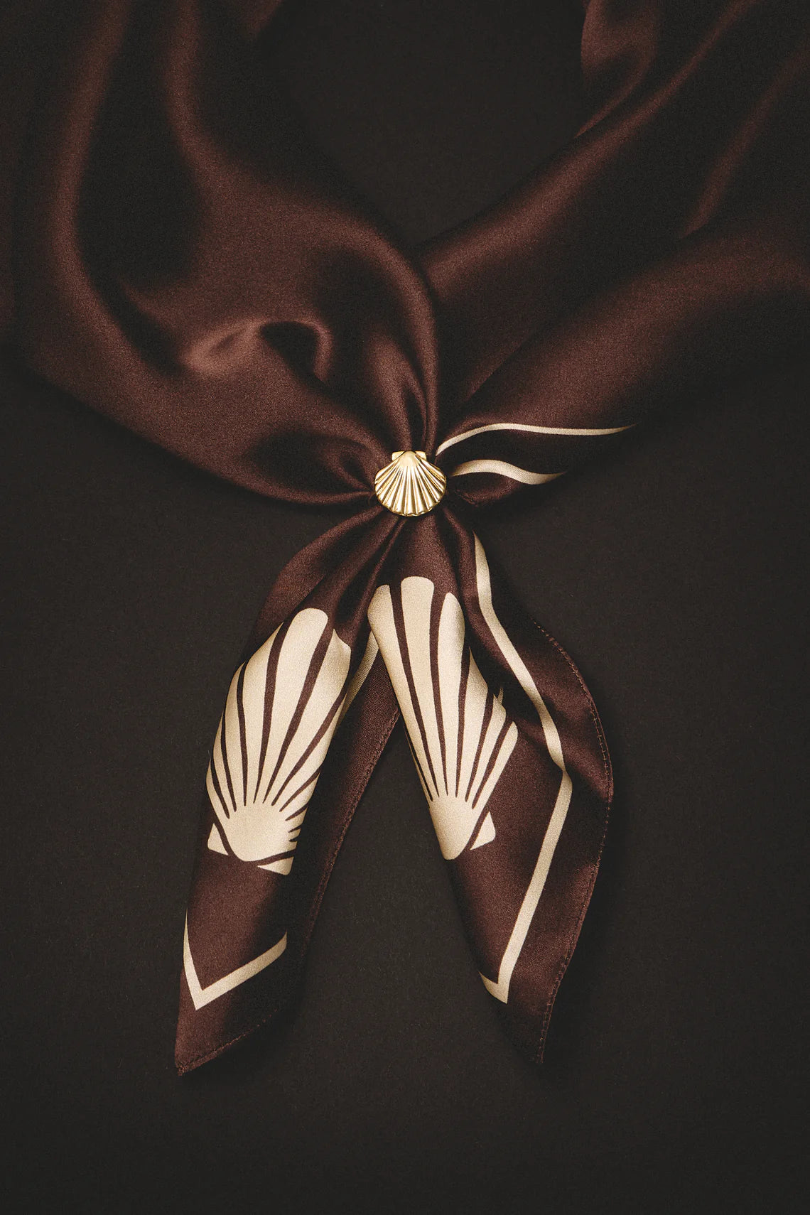 The designer jewelry brand KOLOMATSKA joins forces with the premium silk clothing brand OCEANXSILK to present a special capsule collaboration. At the heart of this duet is a lemon-gold shell ring paired with a bittersweet chocolate-colored silk scarf featuring a graphic shell illustration.