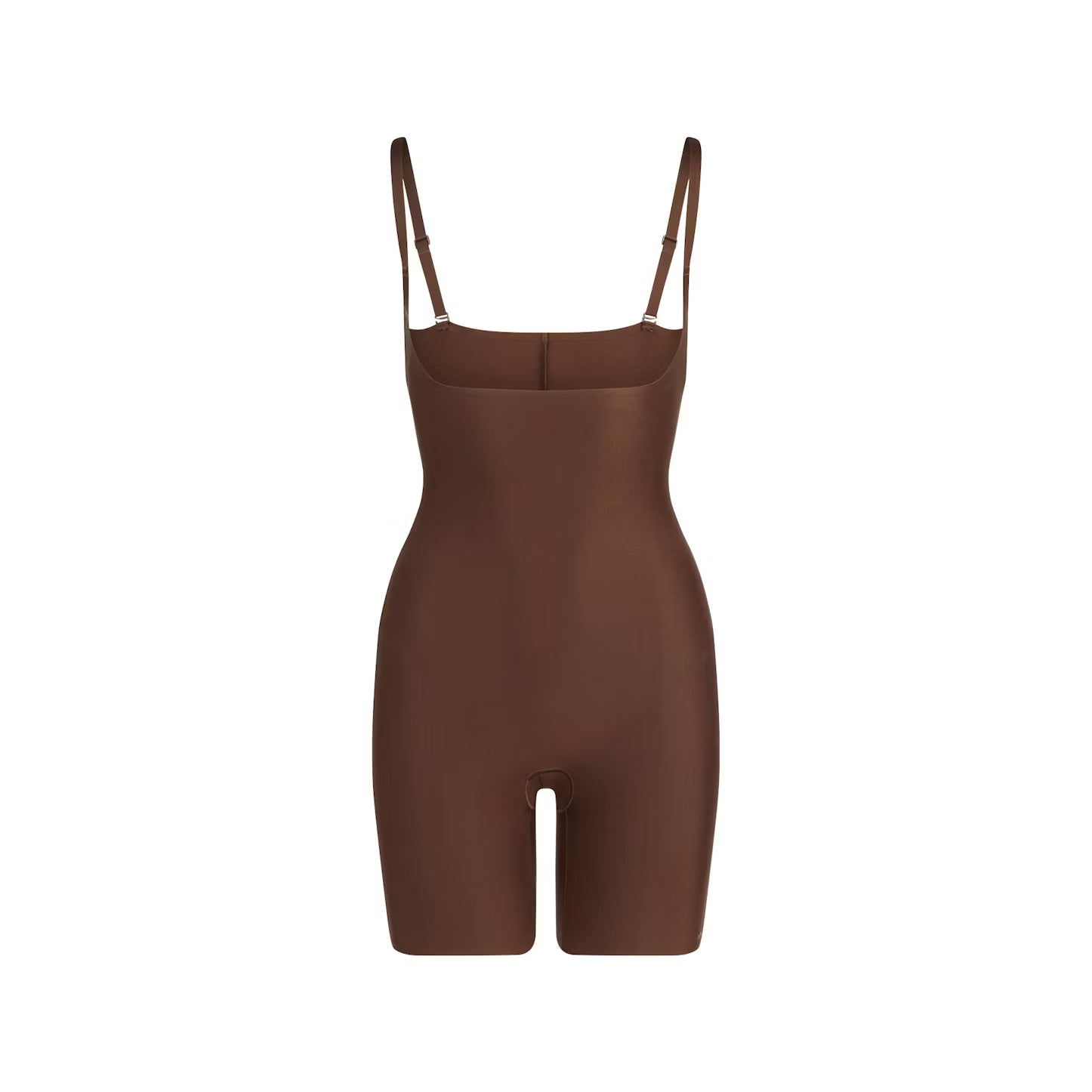 - Open bust neckline, Convertible, Adjustable straps, Open gusset, Mid-Thigh length, Raw cut leg opening, Bonded targeted core compression